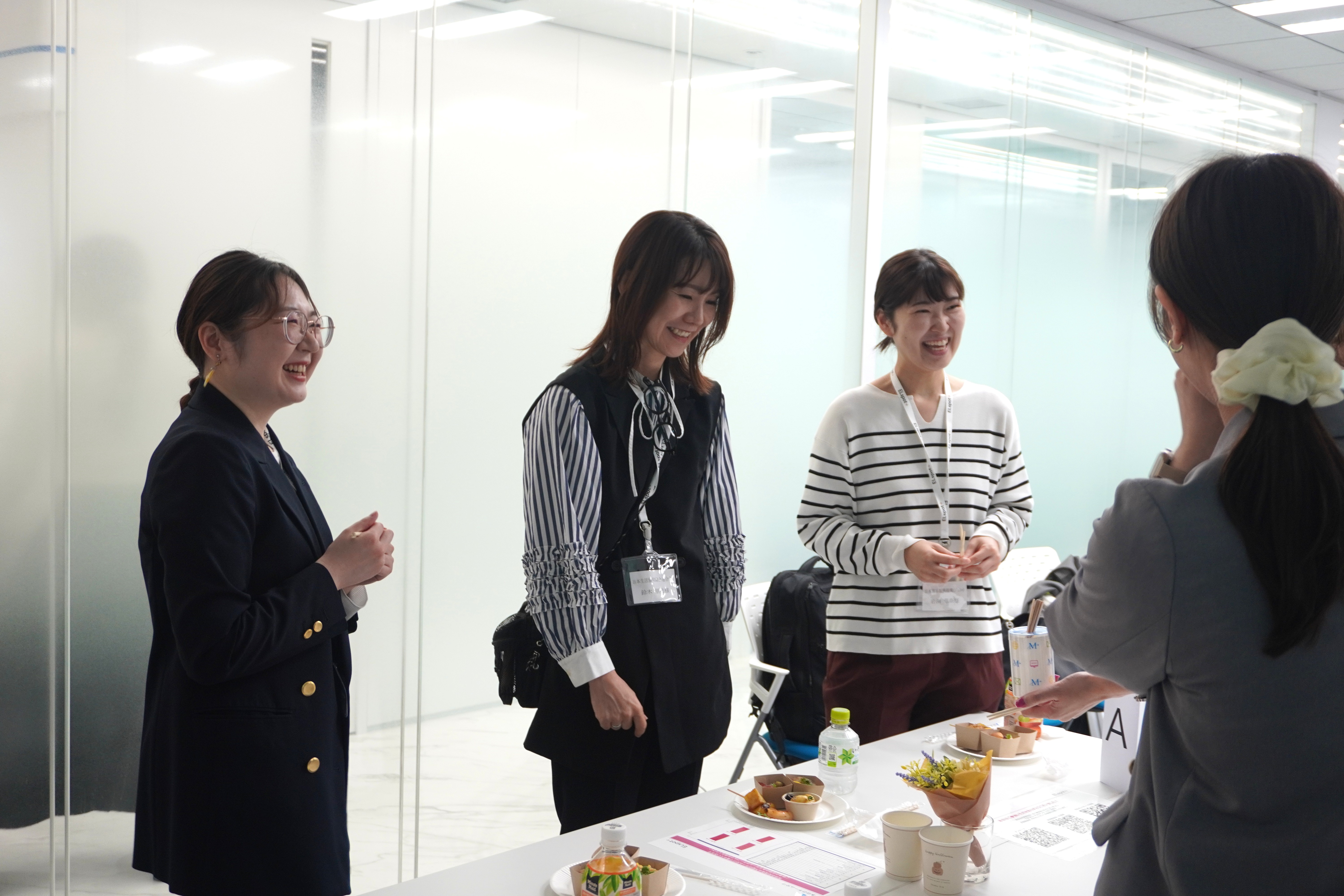 続いて、早速、4~5名のグループに分かれ、キッシュやカナッペ、サンドイッチなどの軽食を囲みながら、参加者同士、自由に会話・交流を行いました。途中でグループをシャッフルしながら、参加者全員で交流を深めました。交流する中で、次のような話題で盛り上がりました。