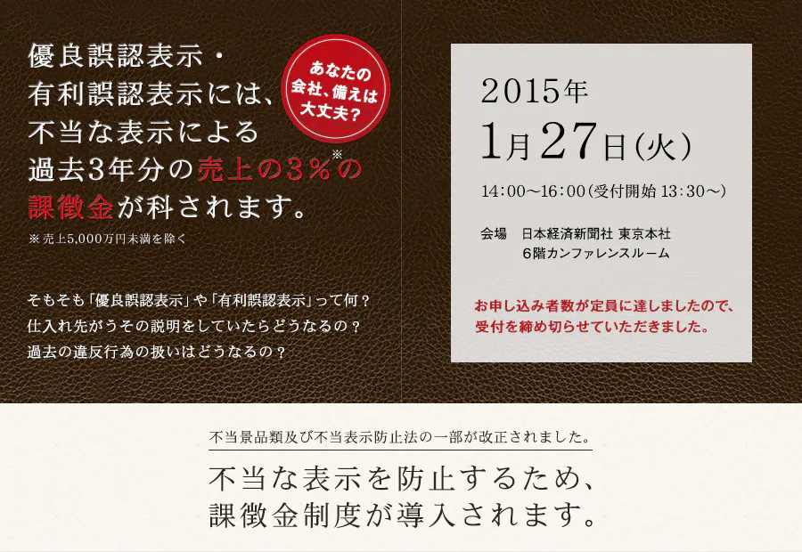 不当表示に対する課微金制度導入に備える、景品表示法改正のポイントとリスク回避についてセミナーを開催します。