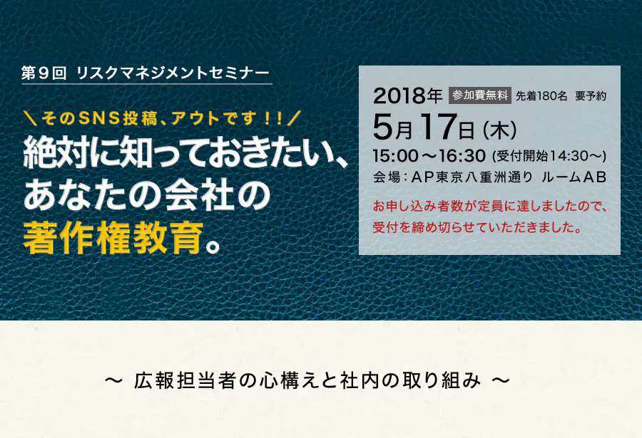 - 広報担当者が取り組むべき著作権教育(60分) 講師:塩島 武徳氏