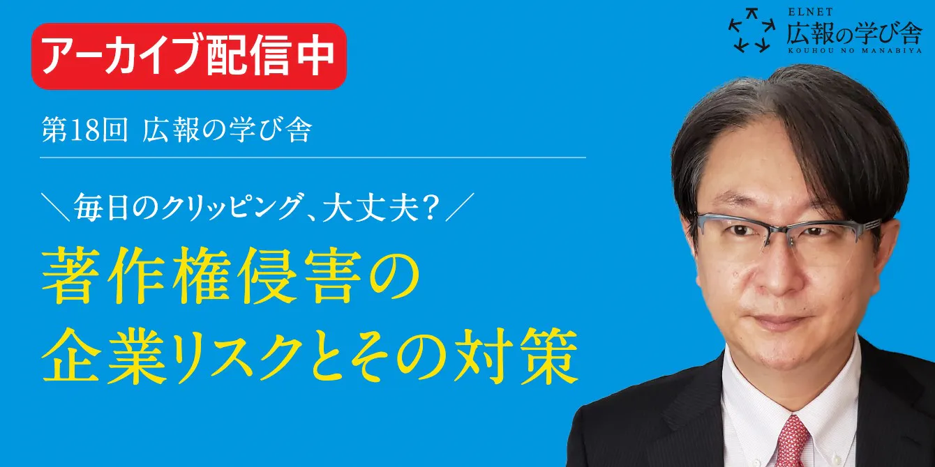 コロナ禍を契機に、会社だけでなく自宅やカフェ、コワーキングスペースなど、さまざまな場所で働けるリモートワークが拡大した今、情報共有が課題となっています。新聞や雑誌に掲載されているタイムリーな記事を役員や関係部署に共有する際に注意しなければならないのが「著作権」です。記事を新聞社などに無断でコピー・スキャンしてメールやイントラネットで共有することは著作権侵害となり、金銭的賠償のみならず社会的信用を失うといったリスクを負うことになります。本セミナーでは、読売新聞グループ本社から法務部知的財産担当の川崎英輝氏をお迎えし、著作権の基礎知識をはじめ、司法判断例や無許諾利用事例なども交えながら企業リスクとその対策についてお話しいただきます。