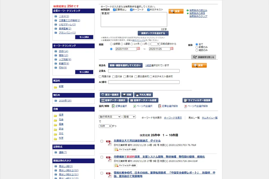 新聞は全国紙、専門紙、地方紙を含む約100紙、雑誌は経済系週刊誌をはじめとした約250誌が対象。約5,000万件の中から記事を検索できます。