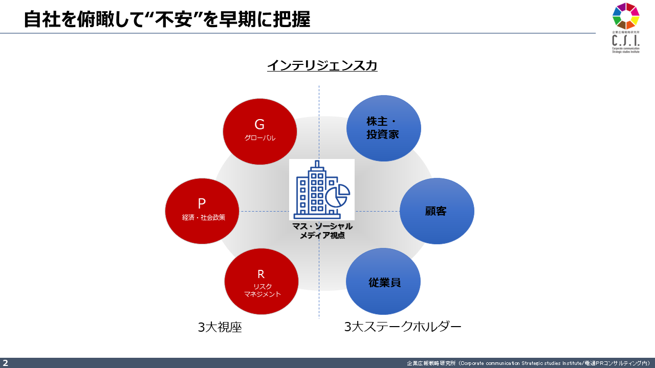 危機管理においてもっとも大切なことは、モノゴトの先をできる限り見通して、先手を打つことです。当研究所ではこうした“先を読む力”を、パブリックリレーションズの3大機能の一つ「インテリジェンス(広聴)」として捉えています。