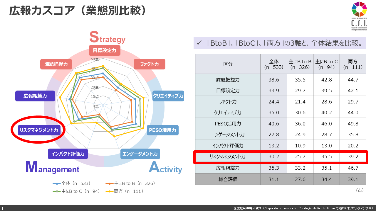 調査にご協力頂いた533社全体のリスクマネジメント平均スコアは30.2ポイントでした。 9つの広報力の中では「インパクト評価力」「エンゲージメント力」「ファクト力」についで4番目に低い結果で、全体平均を下回りました(このグラフには無いですが前回2022年調査よりもやや減少傾向です)。