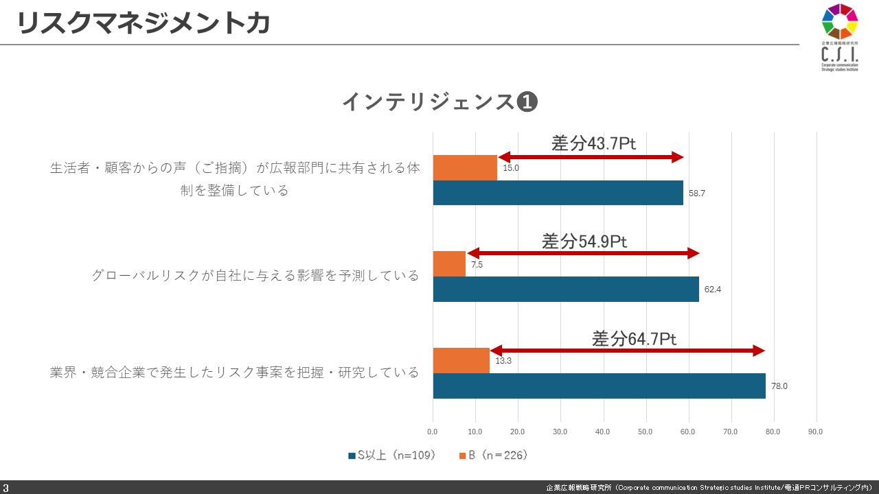 続いて、リスクマネジメント力10設問のうち、社外の環境を捉える3つのインテリジェンス(広聴)項目について、活動量の多いSランク以上の企業(n=109社)と、ボリュームゾーンBクラス(n=226社)とを比較してみました。