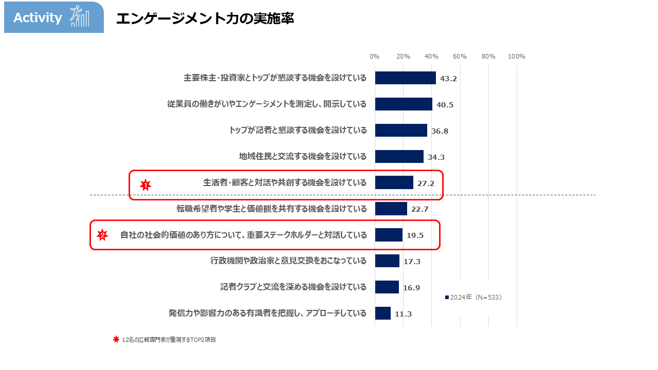 当研究所が行った2024年の企業広報力調査では、「エンゲージメント力」は、Activity領域で一番実施率が低い力でした。