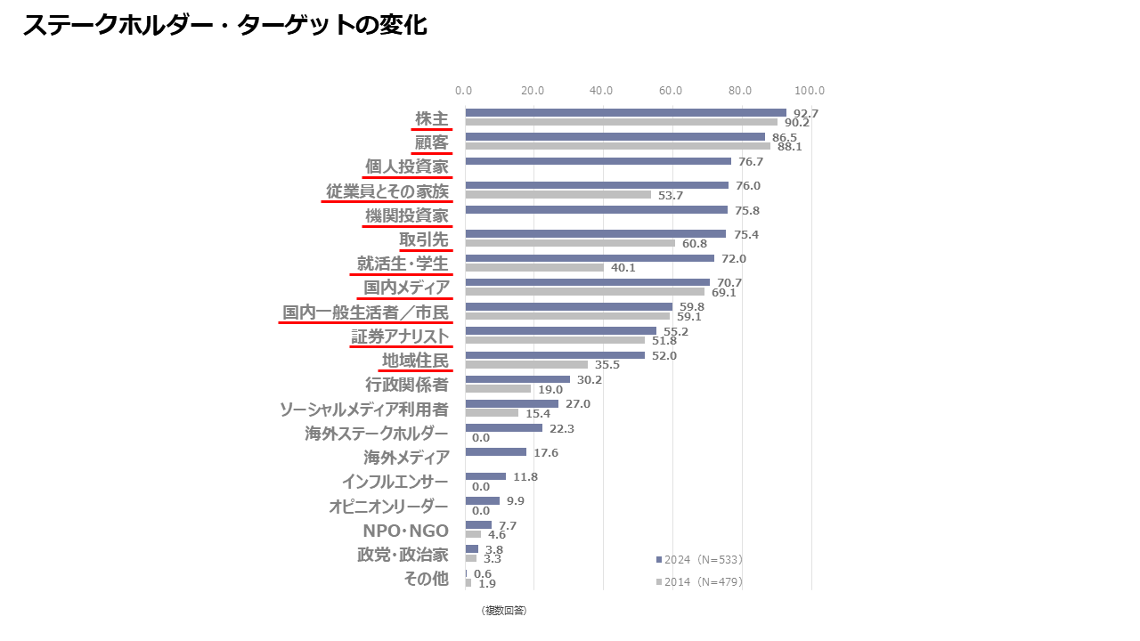 5割を超えるものだけ挙げてみても、株主や顧客、個人投資家、従業員とその家族、就活生・学生、メディアなど、非常に幅広いステークホルダーを重視していることがわかります。