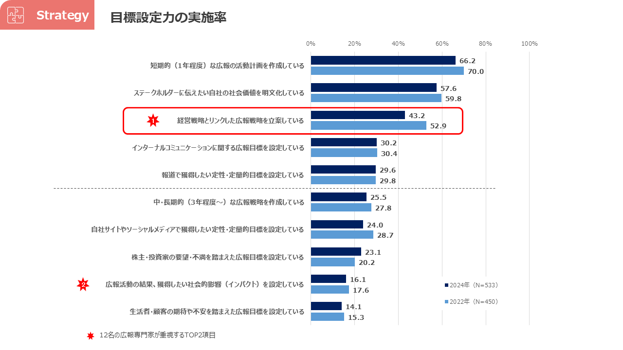 実施率が高いのは「短期的な広報活動計画の作成」、「ステークホルダーに伝えたい自社の社会価値の明文化」で、この2項目が半数を超えていました。一方、専門家が重視する1位の項目で、全体3位の「経営戦略とリンクした広報戦略の立案」は2022年の調査から、約10ptダウンして、43.2%となっています。この結果は、半数以上の56.8%が経営と連動していない広報戦略を立案してしまっている可能性があることを示唆しています。