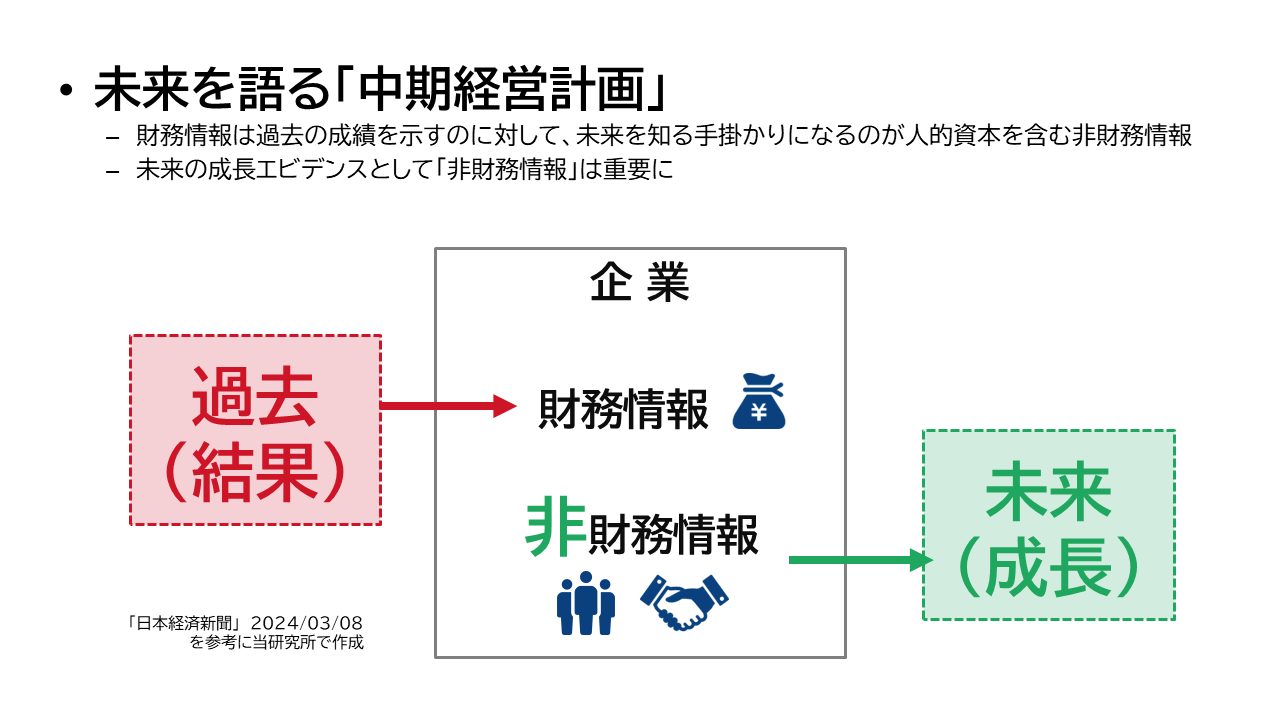 下の図に示すように、「財務情報」は過去の成績を示すのに対して、未来を知る手掛かりになるのが、「非財務情報」です。未来を語る「中期経営計画」の中で、成長のエビデンスとして「非財務情報」を活用しているようです。