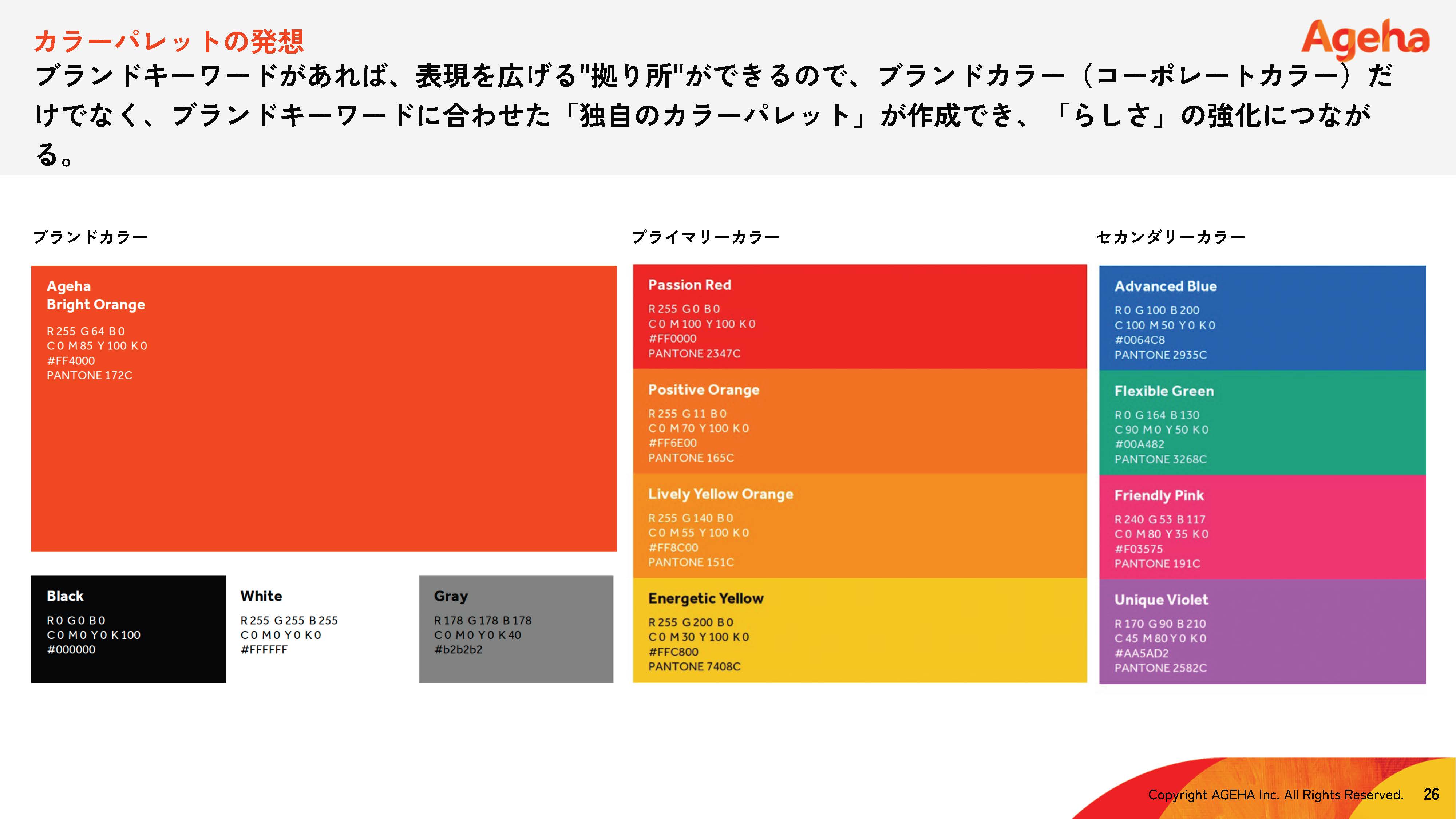 コーポレートカラー(ブランドカラー)が1色だけだと、コンテンツの表現が限定されがちです。そのため、ブランドキーワードを拠り所に、ブランドキーワードに合わせた「独自のカラーパレット」(プライマリーカラー、セカンダリーカラー)を作成し、「らしさ」を強化しました(図4)。