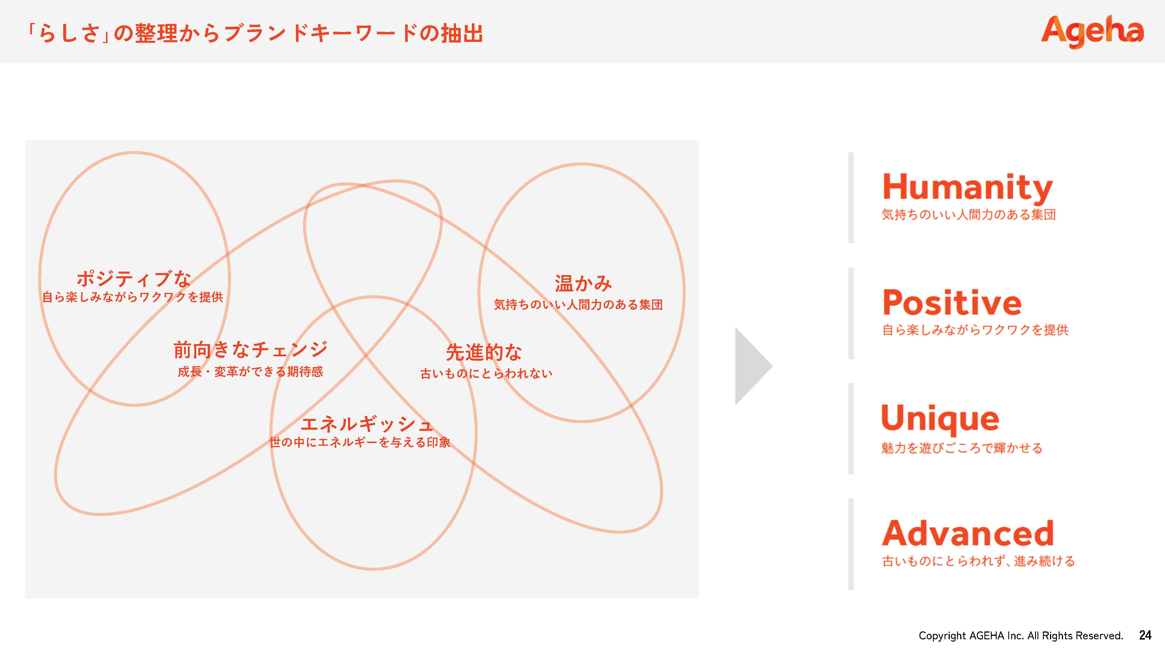 経営層へのインタビュー、社員ワークショップ、全社員アンケートを行い、そこで語られた言葉から、企業の「らしさ」をいくつかのキーワードに整理・分類した上で(図1)、「ヒューマニティ」「ポジティブ」「ユニーク」「アドバイスド」という4つのブランドキーワードを抽出しました(図2)。