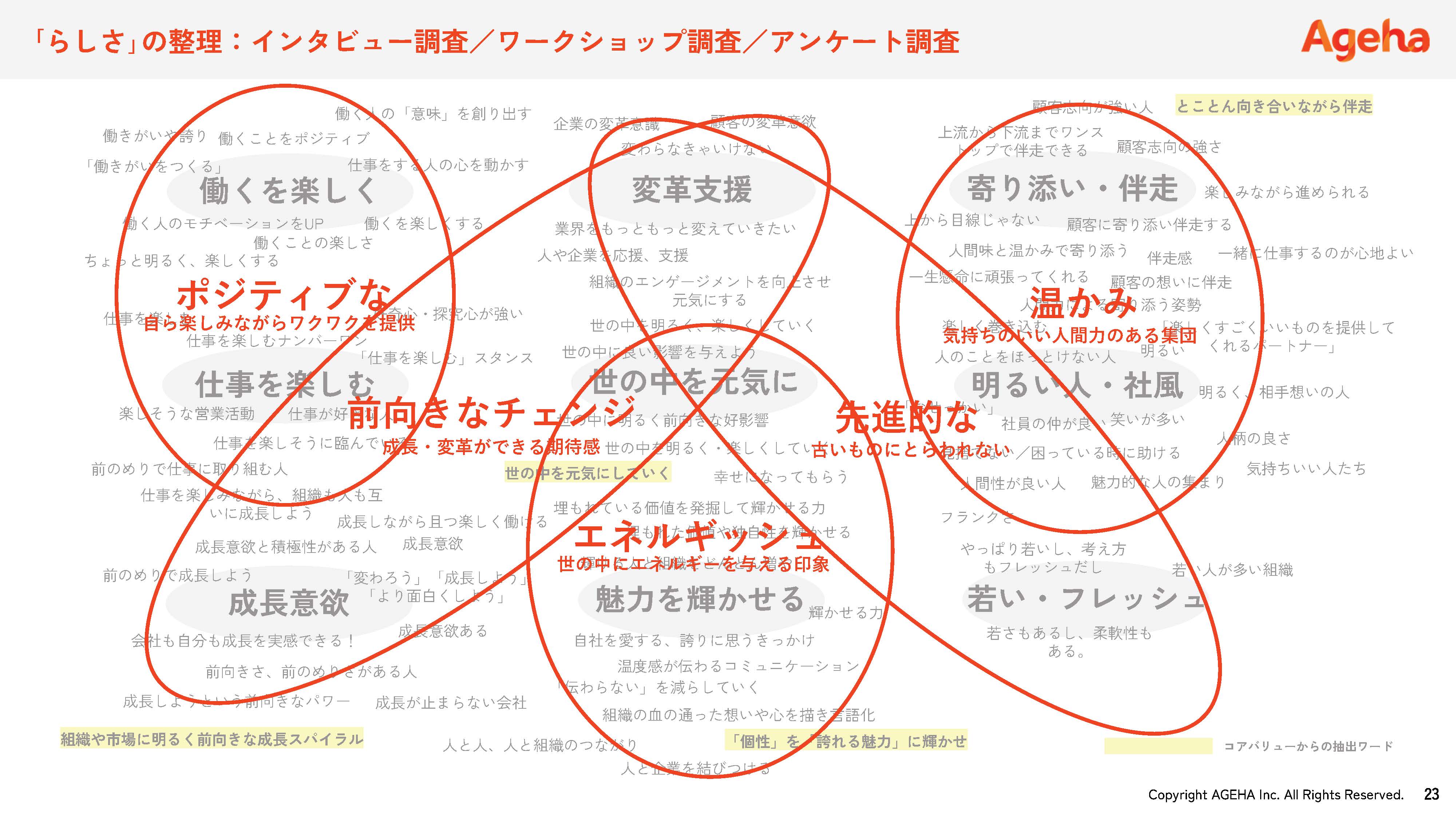 A1:プロセスは会社によってさまざまですが、一般的には、①経営層へのインタビュー、②中堅社員とのワークショップ、③全社員へのアンケートなどの結果に基づいて、ブランド価値(キーワード)を抽出します。ある企業では、半年をかけて全国の社員へのオンライングループインタビューを行いました。