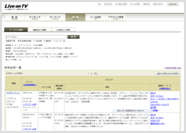 キーワード、TV番組名、出演者名から過去の露出状況を遡って検索できます。